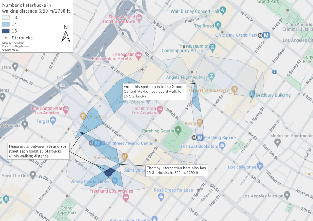 A kernel density analysis results in a simple heatmap showing the distribution of Starbucks in LA County. At first glance, we see a few obvious dark spots on the map–Pasadena, Long Beach, LAX, Santa Monica, the Wilshire Corridor leading up to Hollywood, and, of course, Downtown Los Angeles. It’s clear from the heatmap that Downtown has the highest concentration of Starbucks, but I wanted to know more. I can walk to four Starbucks in under 10 minutes from the middle of Westwood Village; just how many Starbucks can I walk to in the same amount of time in DTLA?