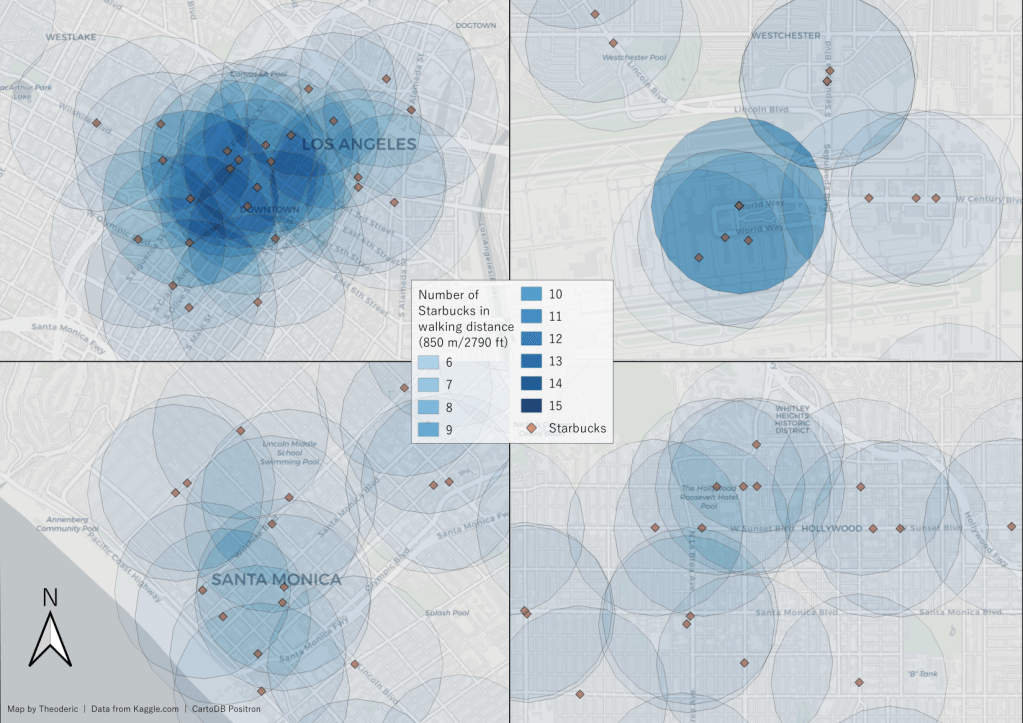 To answer that, we need more than a heatmap. Wikipedia says that the average human walking speed is 1.42 meters per second. Multiplied by 600, a 10-minute walk would take you 852 meters. Here, I’ve rounded it to 850 meters or about 2790 feet. To count how many Starbucks we could walk to within 10 minutes, I created an 850m wide buffer around each Starbucks. The rationale is simple: if two buffers intersect at one point, it means that, from that point, you can walk to two Starbucks. By counting the number of overlapping buffers at each intersection, I arrived at the number of Starbucks within a 10-minute walking distance for every point in Los Angeles County.