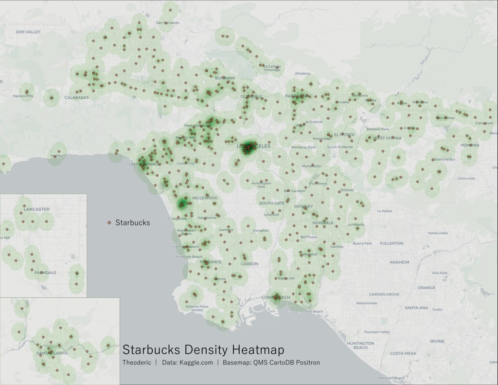 To finish it off, I wanted to focus on the four tiny spots in Downtown Los Angeles where the concentration of Starbucks–15 within walking distance–is the highest in the county. As the map above shows, apart from one tiny spot across from the Grand Central Market, the other three locations are all located in the few blocks bounded by 7th and 8th streets horizontally and Olive and Figueroa streets vertically. Given the abundance of shopping centers in and near the area (the Bloc, Figat7th) and its centrality in the Downtown area as a whole, this is within expectations. Still, I have yet to verify the situation on the ground. Someday, I’ll go and count up all the Starbucks myself–I’ll just have to try getting too hyped up on caffeine.
