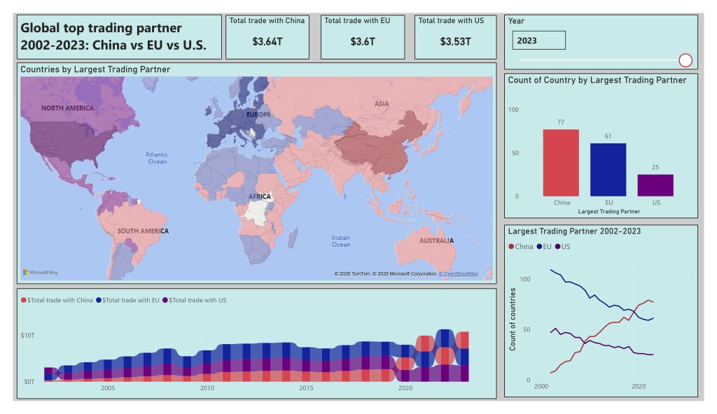 - By number of countries with each as its top trading partner, China overtook the U.S. in 2009 and the EU in 2019. By total trade value, China overtook the U.S. in 2020 and competes with the EU between 2021-2023.